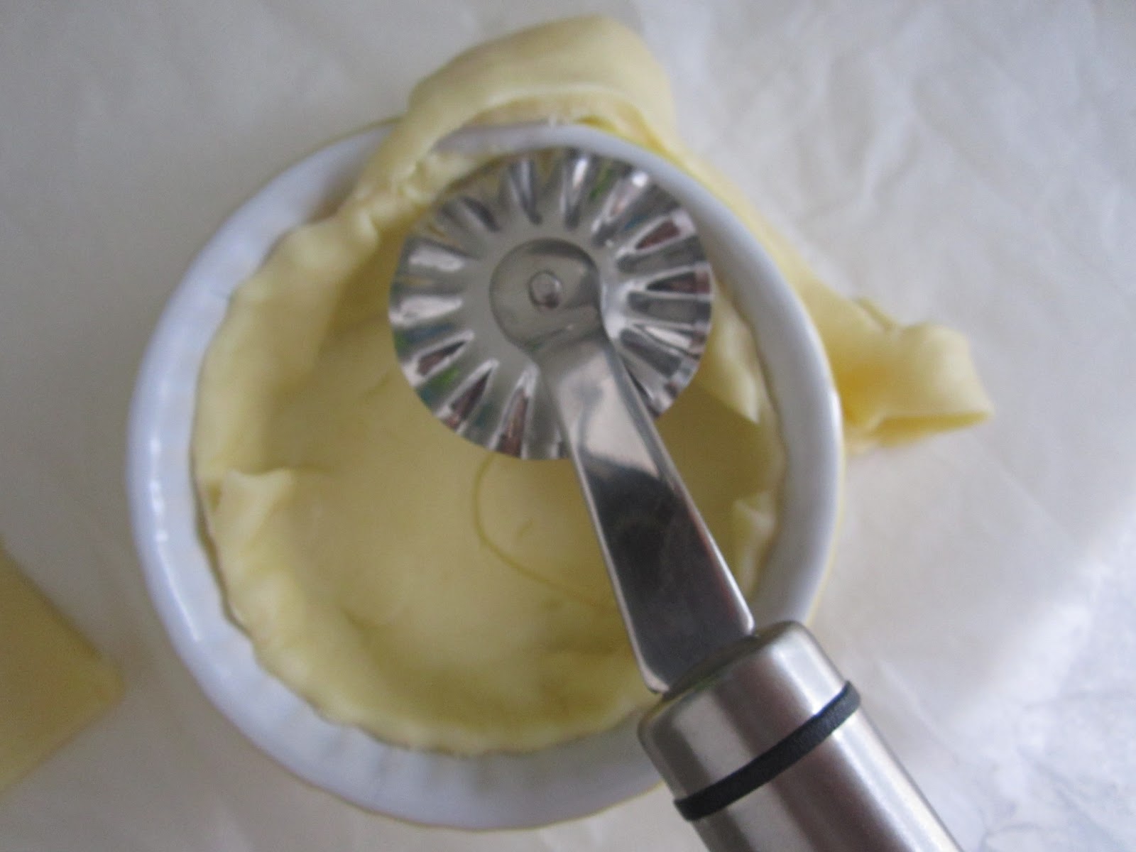 Sistemate i quadrati di pasta brisè nelle formine e con una rotella tagliate la pasta in eccesso.
