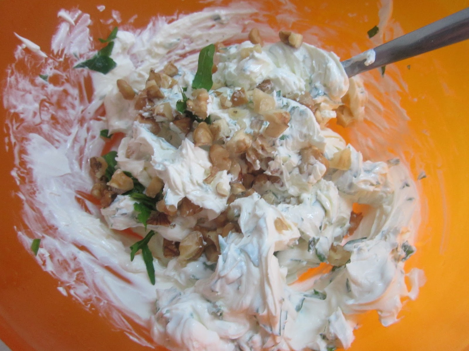 Ammorbidite la philadelphia con un cucchiaio di olio e unite 100 g di rucola tritata.