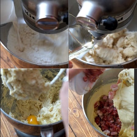 • Quando l'impasto diverrà liscio ed uniforme (ci vorranno circa 5 minuti con la planetaria e 10 minuti a mano) Unite i salumi ed il formaggio.