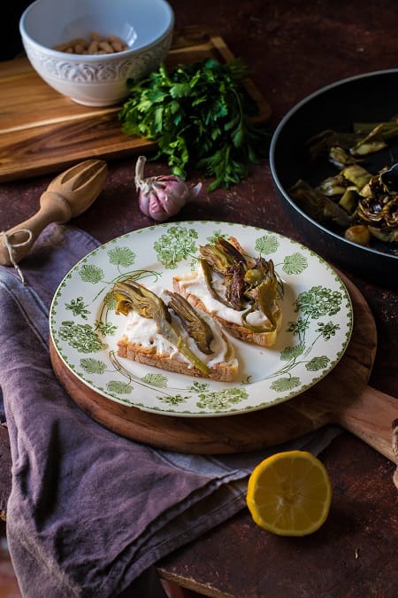 Bruschetta con carciofi e crema di fagioli e feta