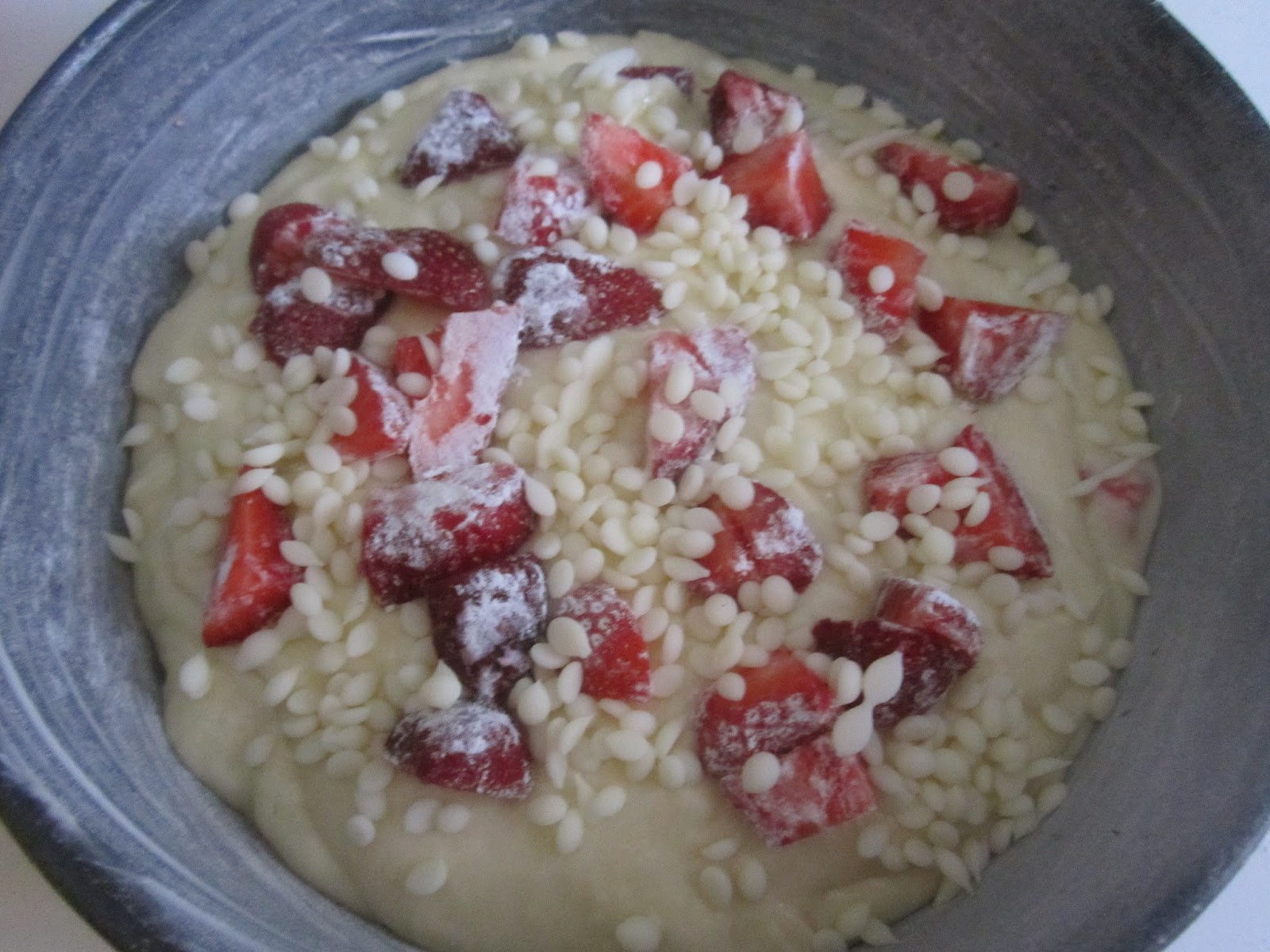 Versate l’impasto in una teglia imburrata ed infarinata. Ricopritelo con le fragole rimanenti (che vanno sempre infarinate) ed ultimate con il cioccolato bianco ridotto in scaglie (io ho usato delle gocce di cioccolato bianco).