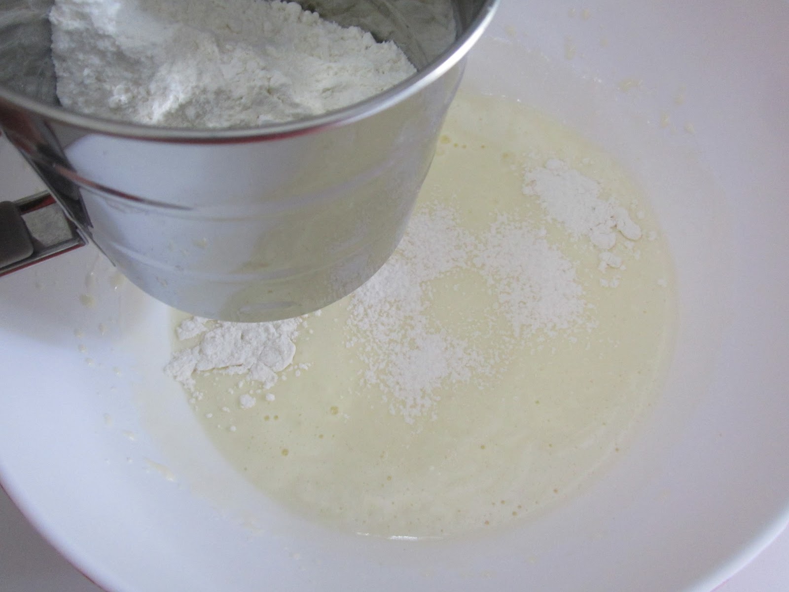 Unite la farina setacciata con il lievito e mescolate delicatamente con una spatola con movimenti dall’alto verso il basso.