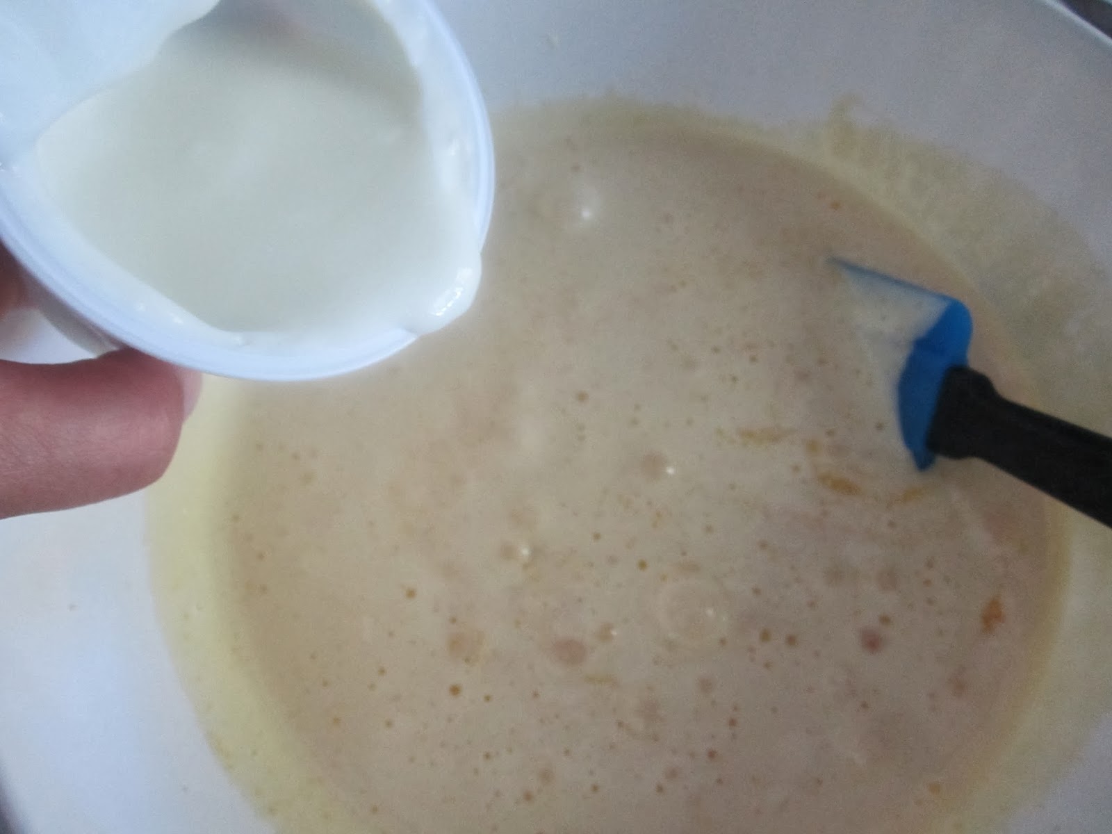 Aggiungete lo yogurt e l’olio e amalgamateli con una spatola con movimenti dall’alto verso il basso.