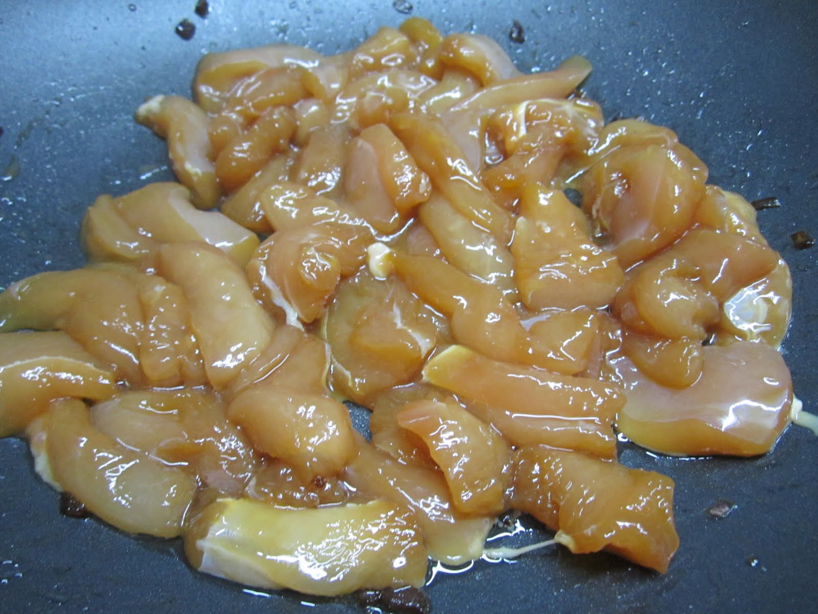 Tagliate il petto di pollo in pezzetti rettangolari (a me piacciono così, ma ovviamente la scelta è libera) e mettetelo a marinare con tre cucchiai di salsa teriyaky per una ventina di minuti(un piccolo trucco è quello di farlo marinare in una bustina chiusa, diventerà molto più saporito).