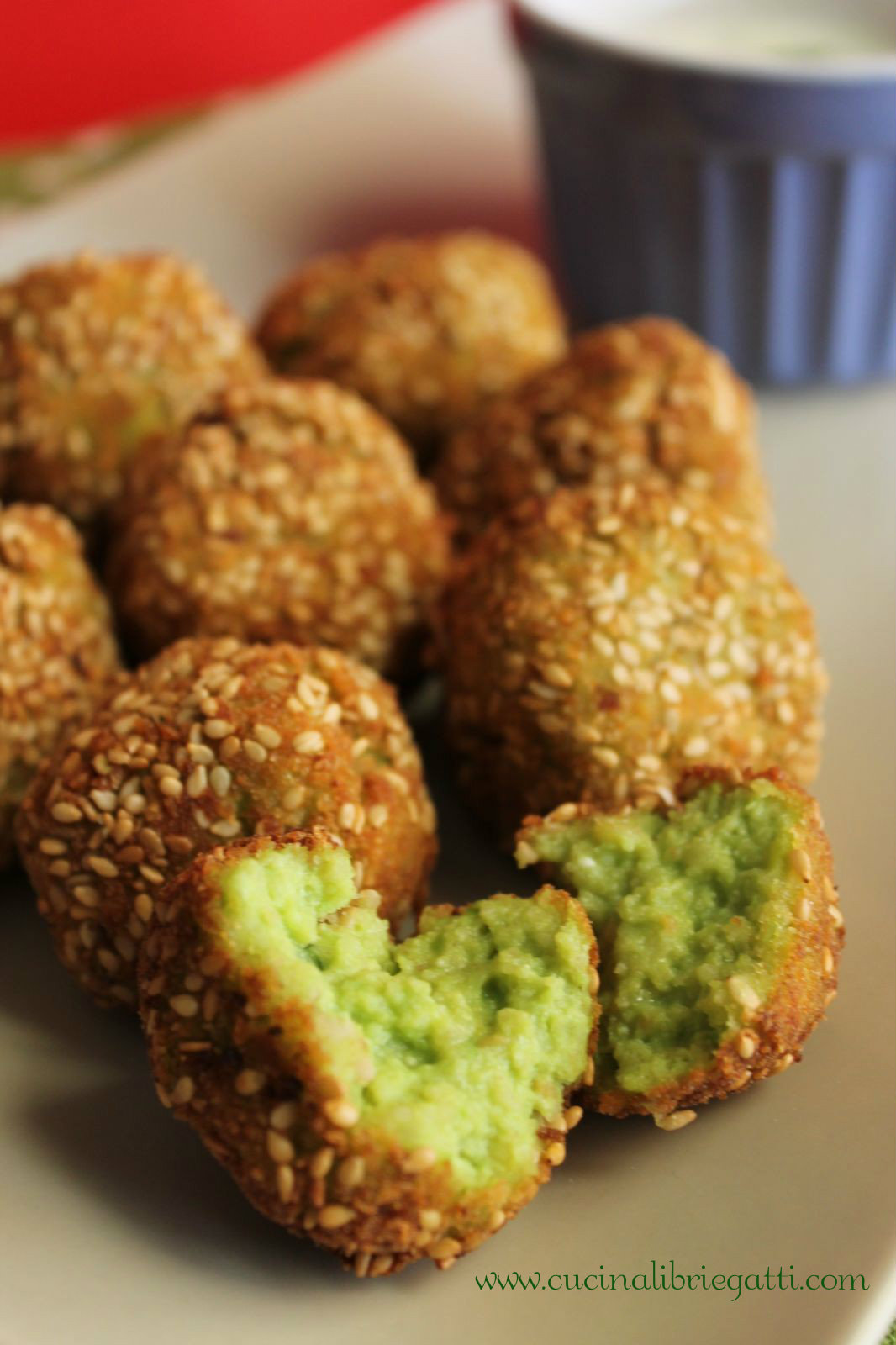 Queste polpette di piselli sono accompagnate con una salsina allo yogurt che le rende ancora piรน golose!