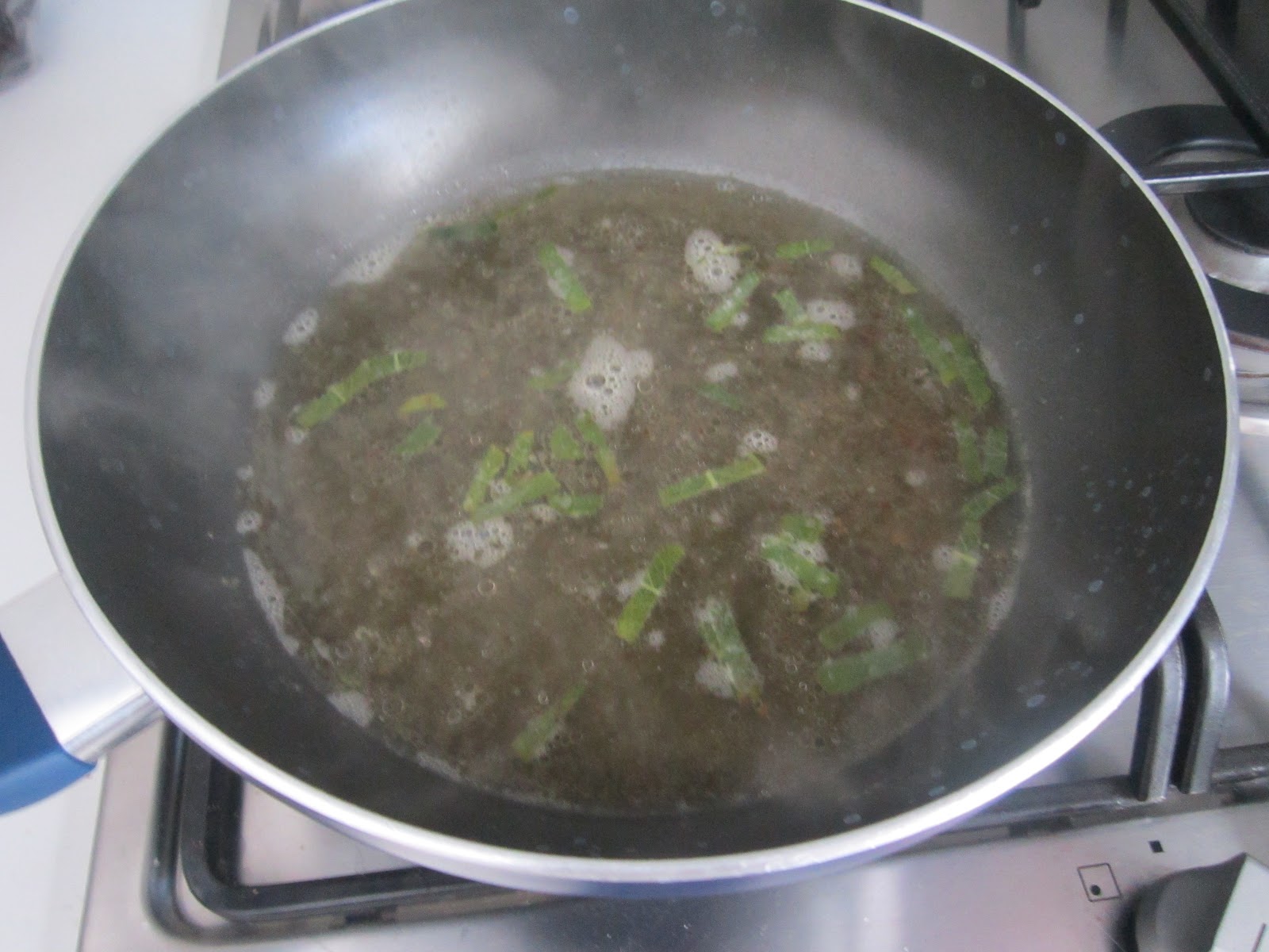 Preparate la salsa. Lavate e affettate le foglie di salvia e fatele appassire un paio di minuti nel burro.