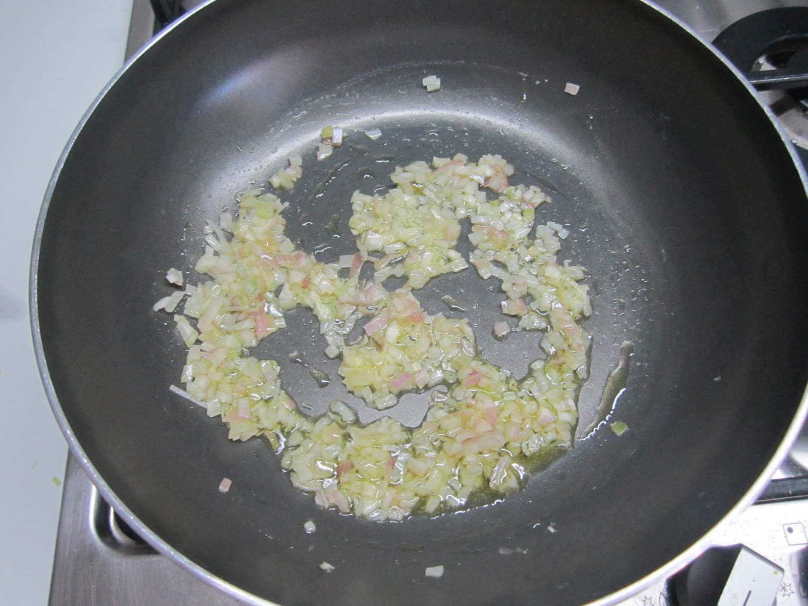 Tritate lo scalogno a fatelo soffriggere in due cucchiai di olio.