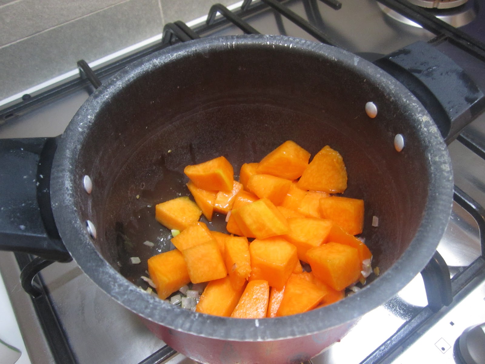 Rosolate lo scalogno tritato in due cucchiai di olio, unite la zucca a fate stufare a fuoco dolcissimo per 15 minuti o fino a quando non diventa tenera (se dovesse asciugarsi troppo unite un filo di acqua). Salate e unite il peperoncino (la quantità dipende dai vostri gusti).