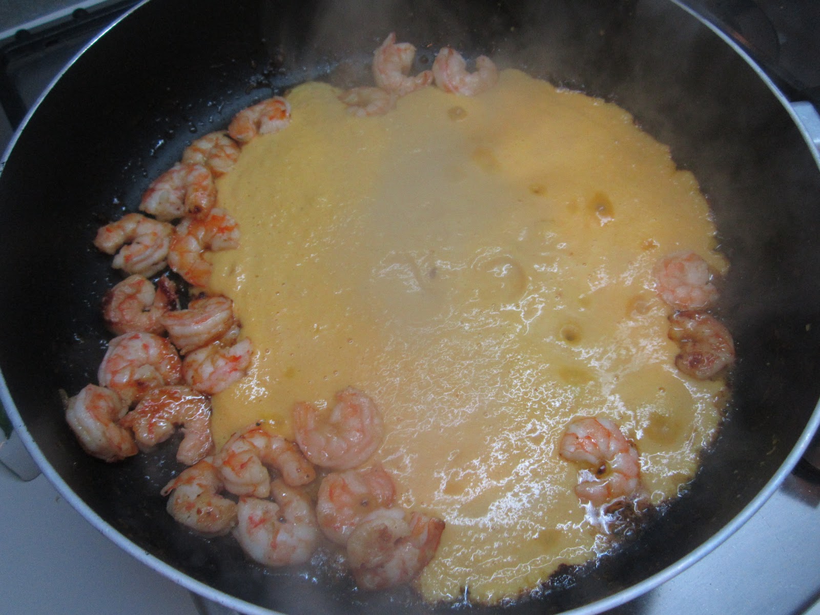 Versate la crema di zucca nella padella con i gamberi e fate insaporire il tutto per un paio di minuti.