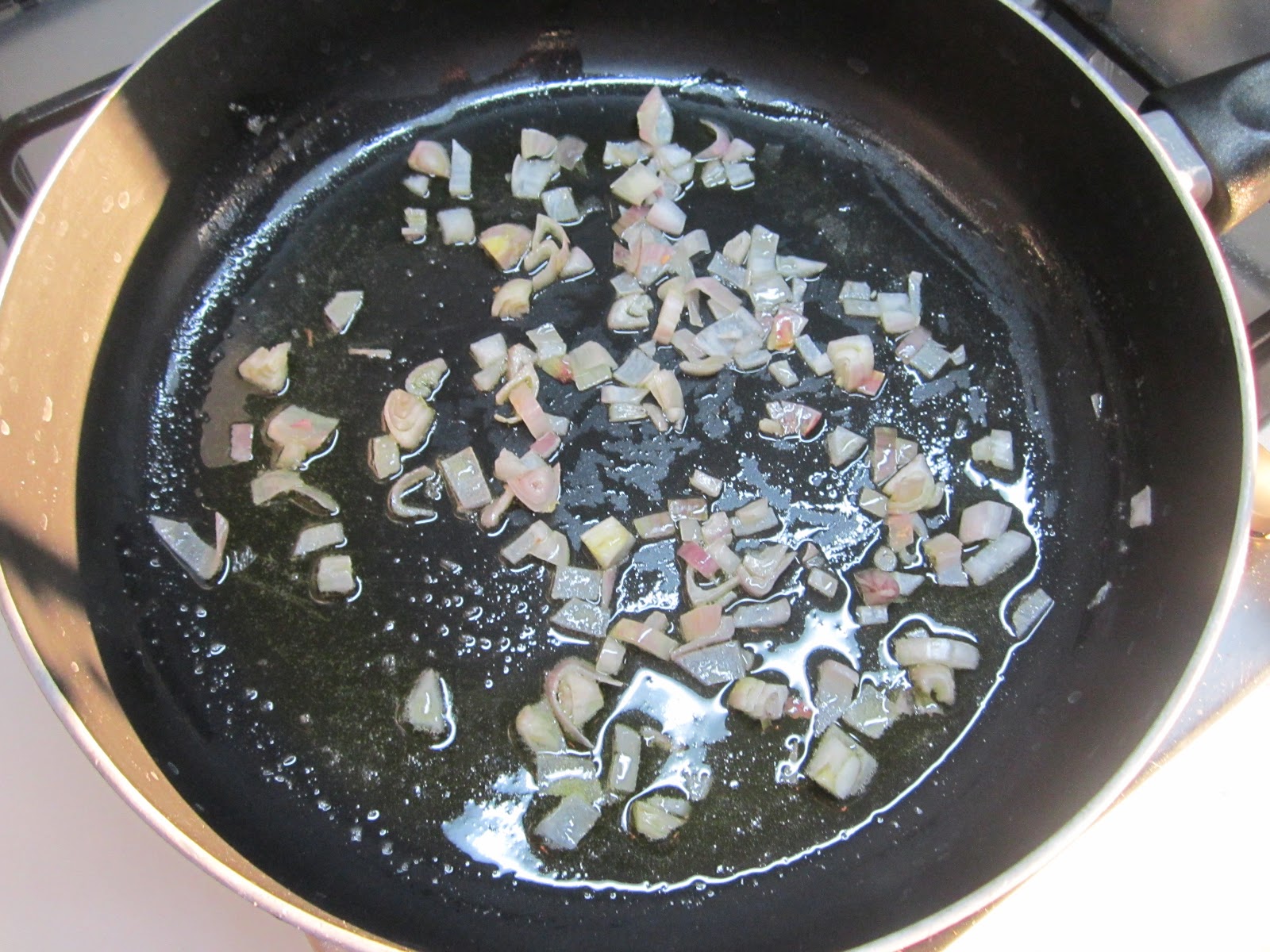 Affettate lo scalogno e fatelo soffriggere in un cucchiaio di olio.Affettate la lattuga in striscioline sottili.
