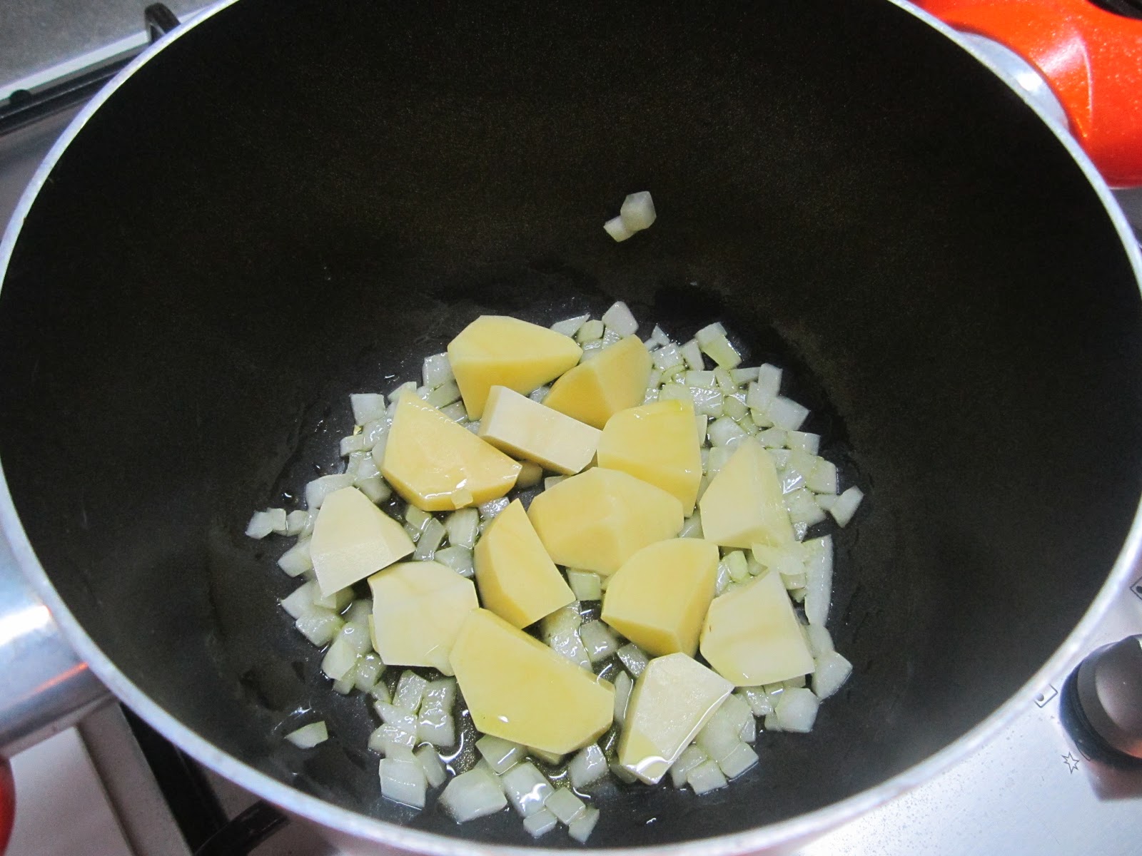 Rosolate la cipolla tritata un paio di minuti in 2 cucchiai di olio. Poi unite la patata tagliata a cubetti e fate insaporire un altro paio di minuti.