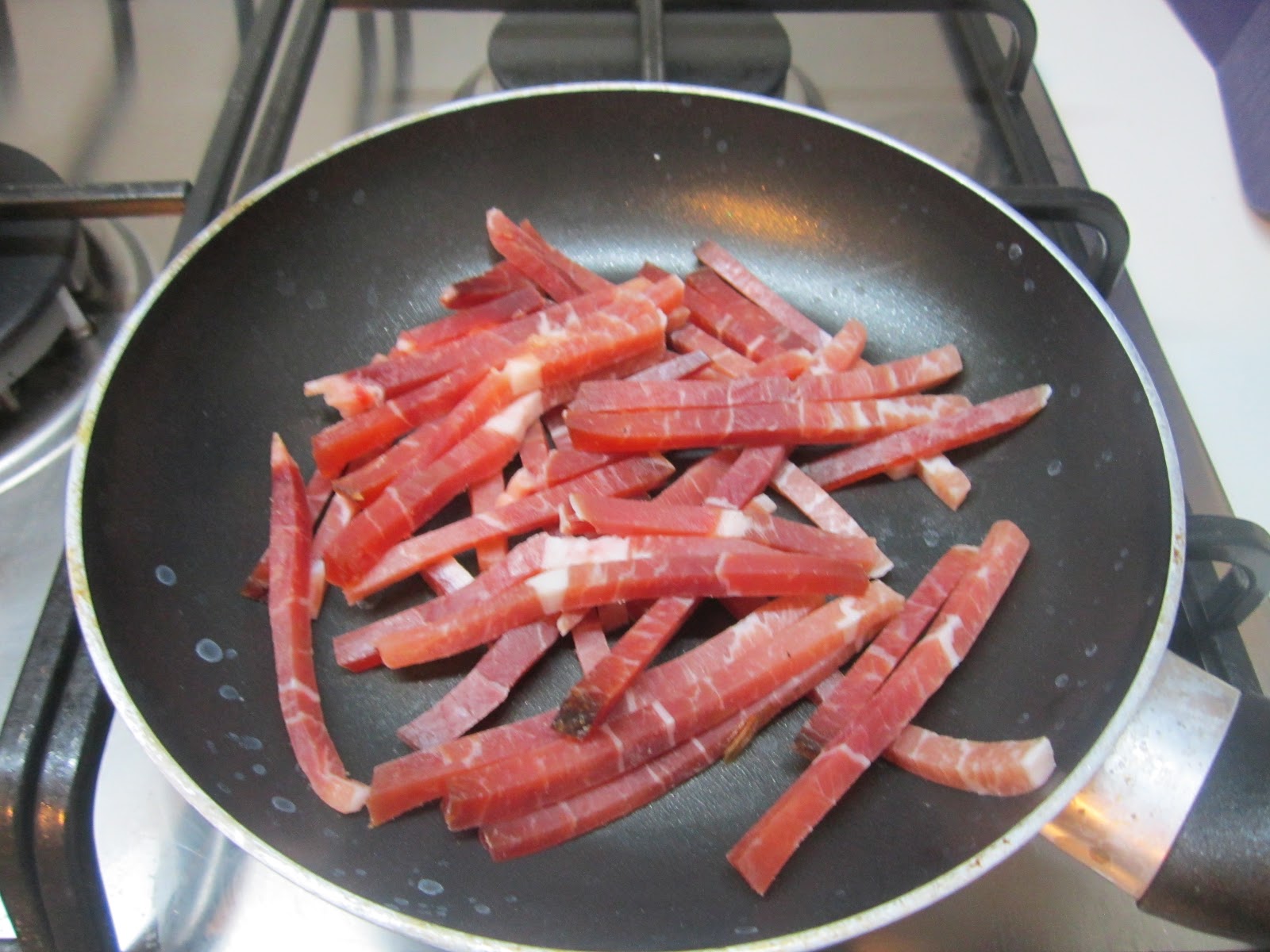 Tagliate lo speck a listarelle e mettetelo a cuocere in un padellino antiaderente (senza olio) fino a quando risulterà croccante.