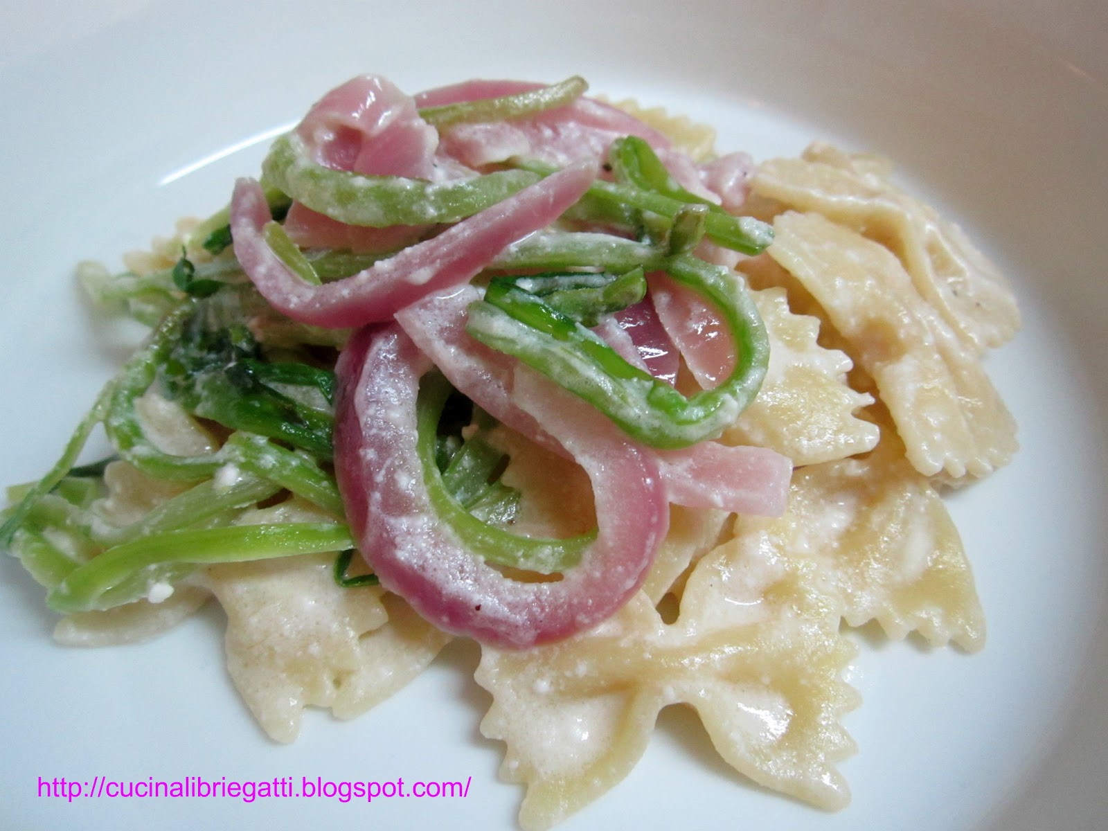 Farfalle con cipolle rosse puntarelle e fonduta di caprino