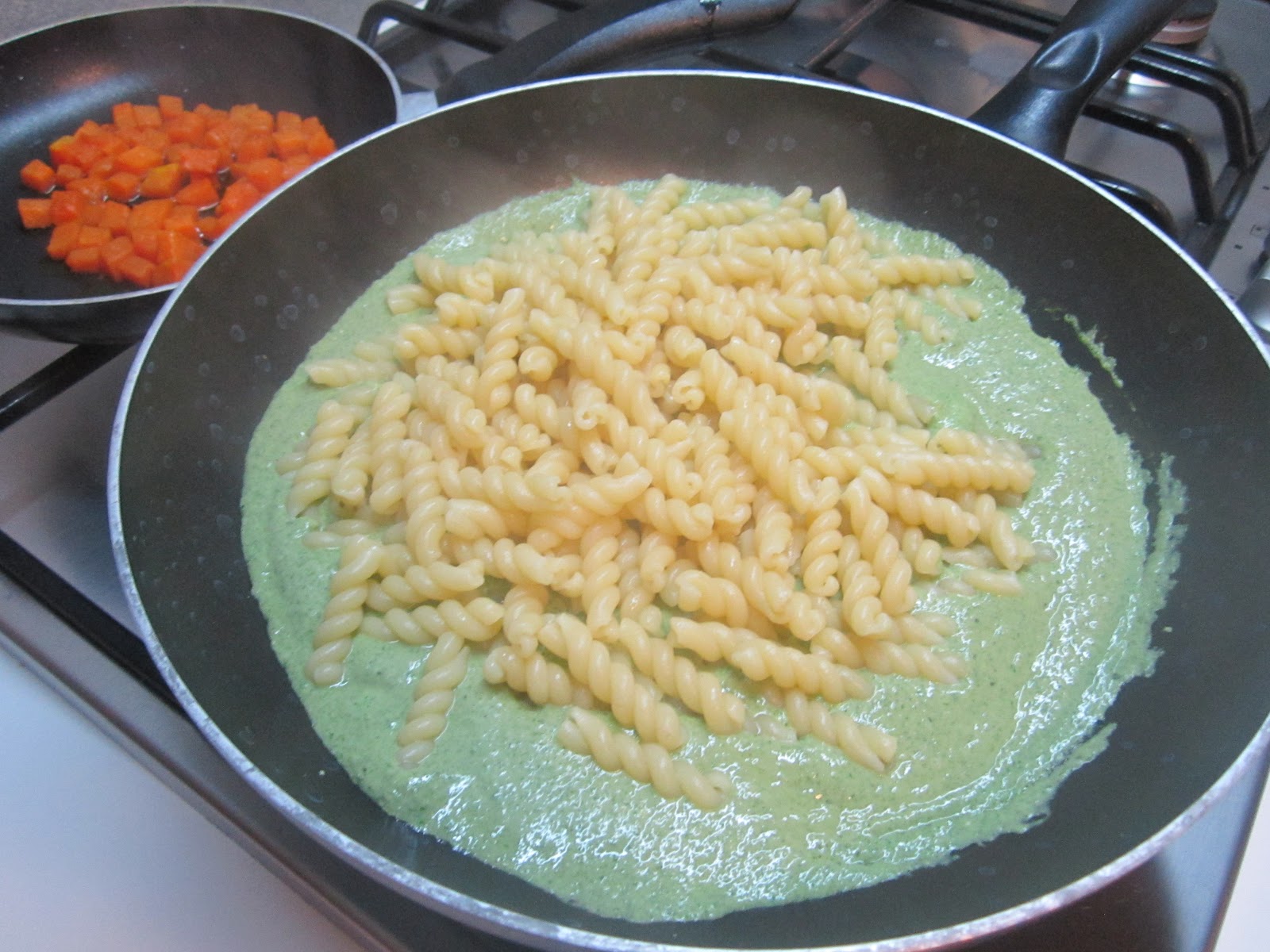 Cuocete la pasta e fatela saltare con il pesto (amalgamandole, se serve, con un pò di acqua di cottura). Infine unite la zucca.