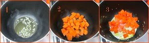 2.Unite la zucca tagliata a pezzetti e fate insaporire.