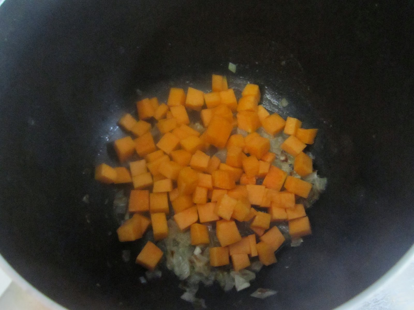 Aggiungete la zucca tagliata a dadini e fate cuocere per 5 minuti.