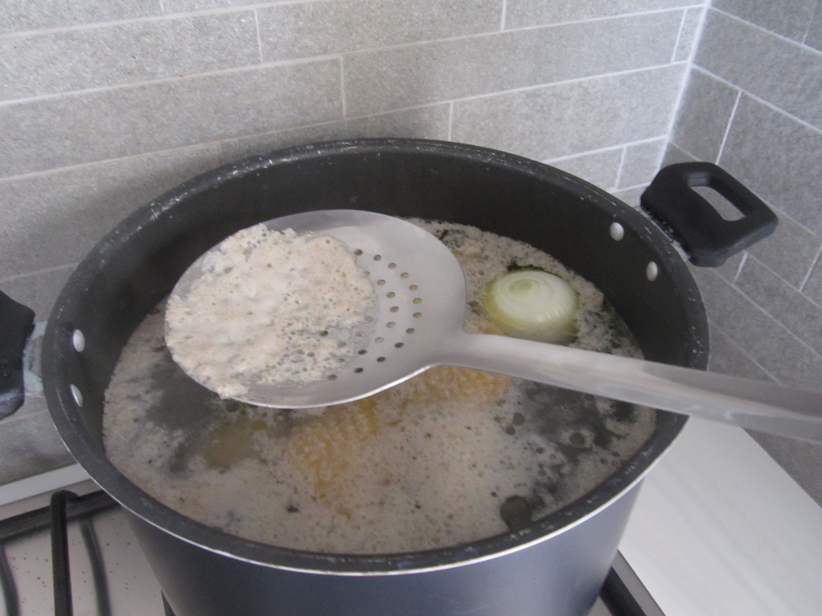 Mettete tutti gli ingredienti nella pentola (la cipolla intera), aggiungete l’acqua e portata ad ebollizione (da fredda).