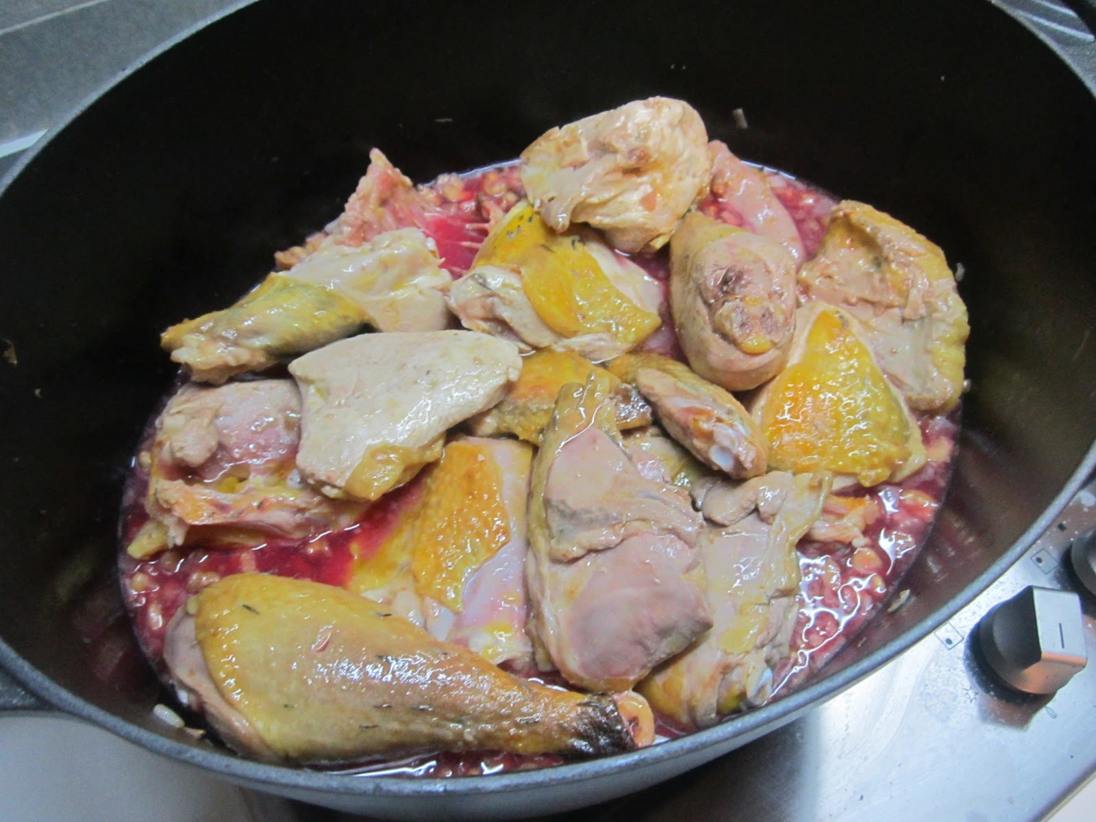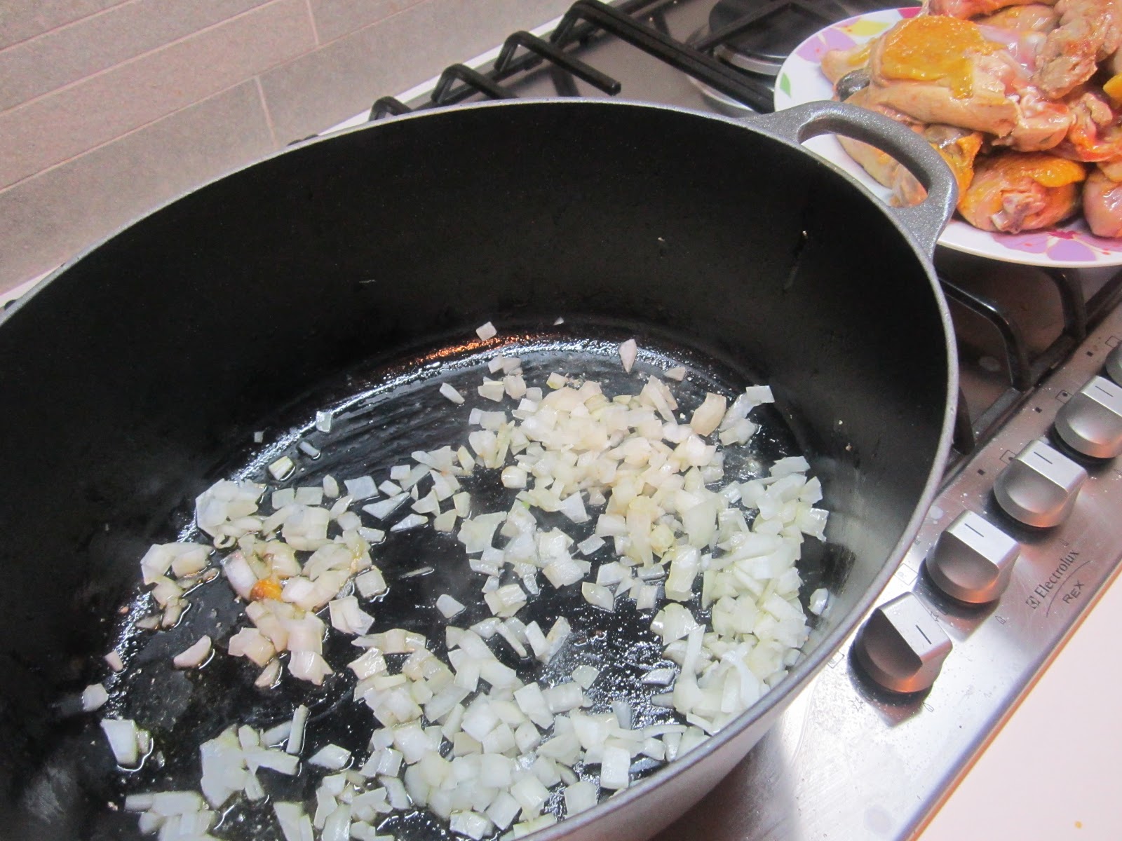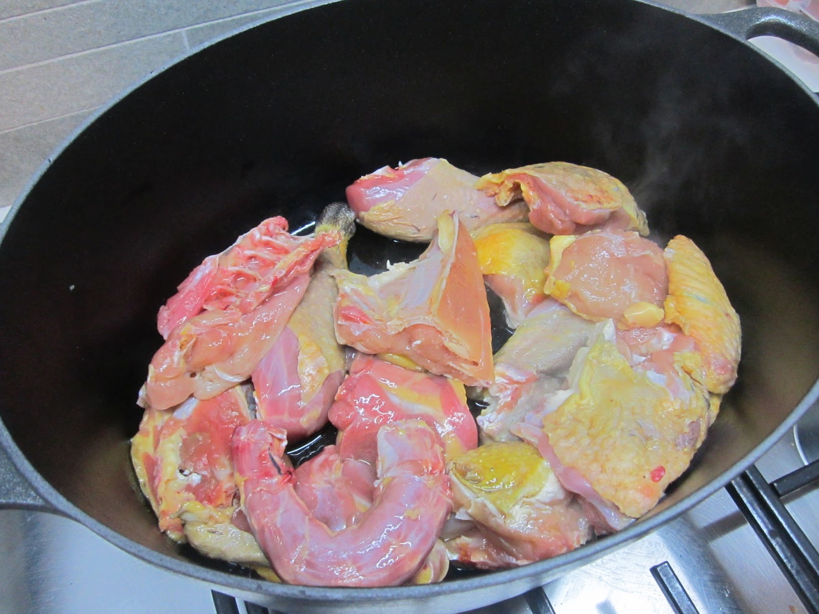 Pulite e fate a pezzi la faraona (oppure fatelo fare al macellaio come ho fatto io :-P) e fatela rosolare in un tegame (o in un bella pentola di ghisa) con 2 cucchiai di olio.