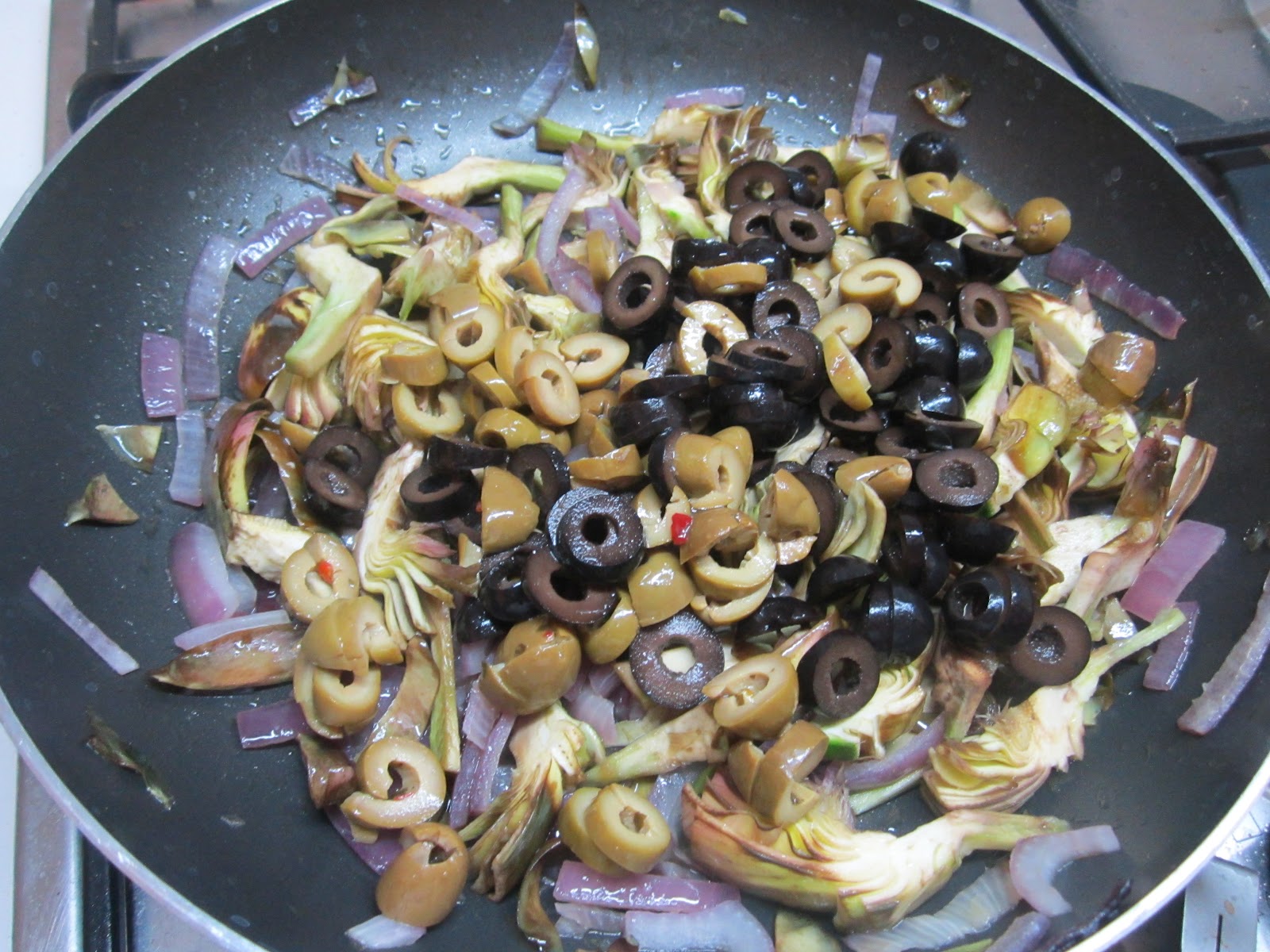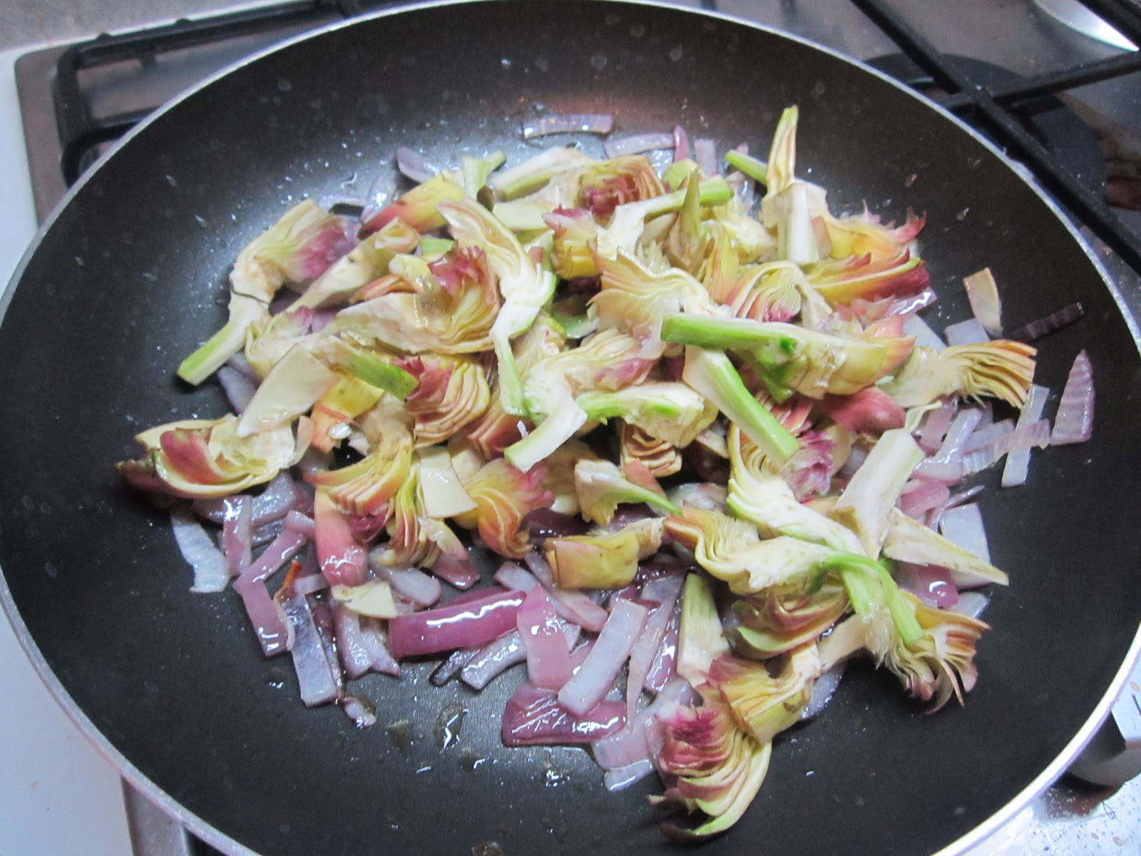 Tagliate i carciofi (seguite il procedimento indicato qui) e aggiungeteli alle cipolle e fateli cuocere per cinque minuti.