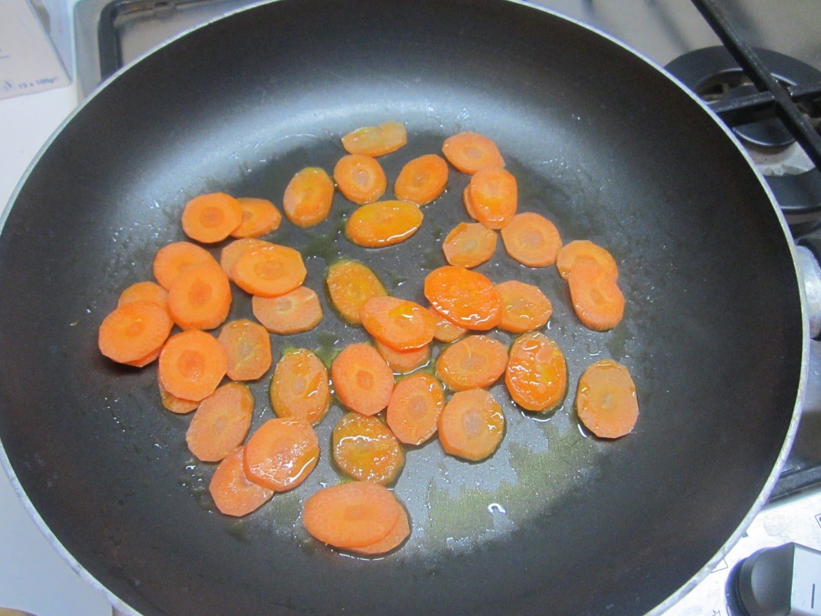 Tagliate la carote a rondelle sottili e fatele stufare per 5 minuti in 2 cucchiai di olio.