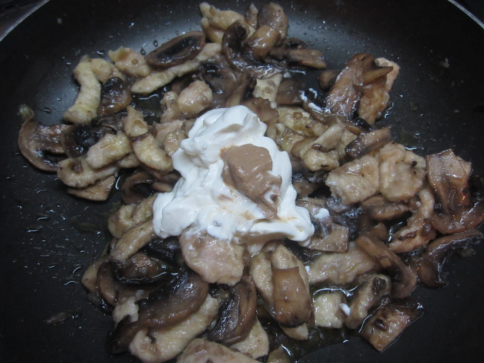 Una volta cotto il pollo versatelo nella padella con i funghi e fate insaporire un paio di minuti.